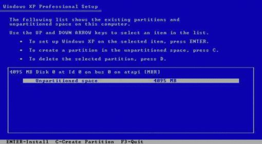 9. Select or create the partition on which you will install Windows XP Professional. Please read the on screen instructions carefully. If you so not need to create partition, skip this and jump to step 10.
