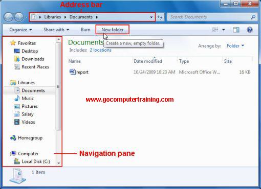 As you open Windows 7 folders and subfolders to get to the file you want to use in one of the Explorer windows, Windows keeps track of the path in the address bar. The Address bar appears at the top of every Explorer window and displays the current location on your computer. This path starts with the disk or folder icon followed by the names of drives, folders, and subfolders that separated by arrows. There are typically 2 ways to go to a location, either by clicking on a location or just type a new location (even a web site address). The Navigation pane that appears in the left column of an Explorer window enables you to open the folders and subfolders containing the folder with the files you want to work with.